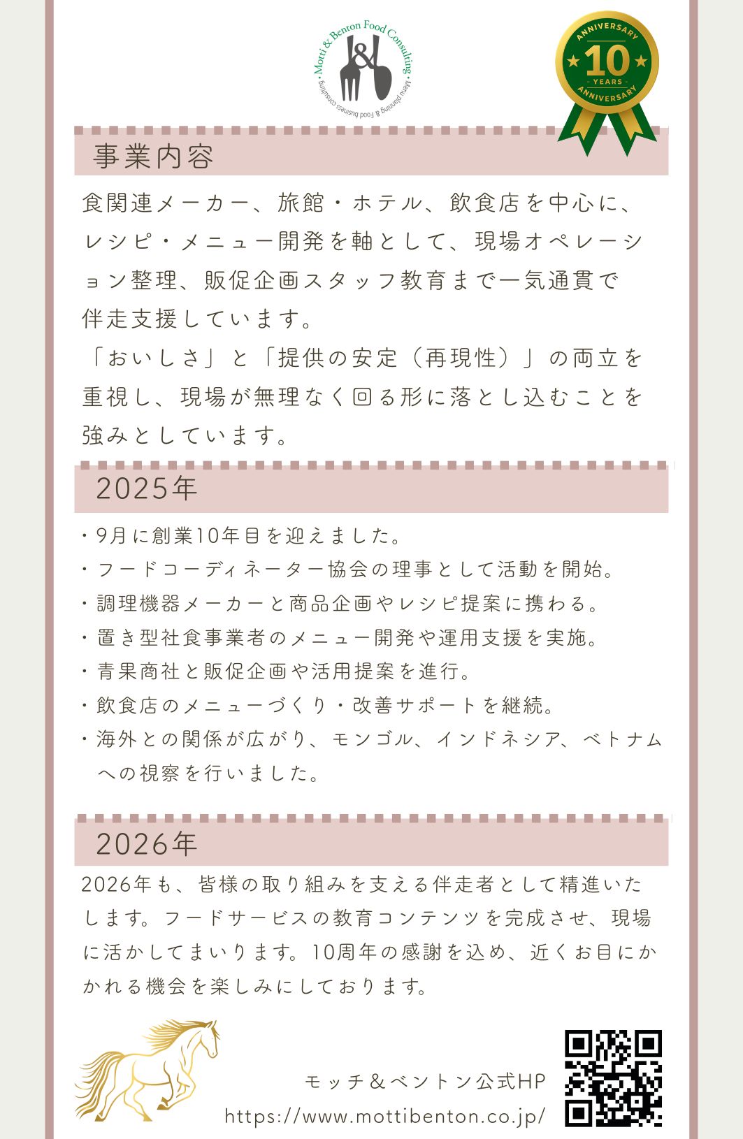 なお、InstagramやHPでは、引き続きフードコンサルティングに関する情報や活動の様子を発信しております。 本年も皆様がご健勝でご多幸でありますよう、心からお祈り申し上げます。 10周年の感謝を込め、近いうちにお目にかかれる機会を楽しみにしております。